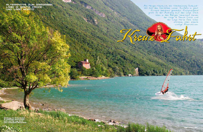 Every time you can't find a parking space in Malcesine at seven o'clock in the morning, someone in the know whispers about a sacred place hidden somewhere behind the peaks of the Dolomites. In this place of tranquillity, there would be salvation: Snow White? No, but wind and hardly any crowds! Lago di Santa Croce is the name of the lake, the lake with the holy cross. There's no sign of the cross for miles around when I first set eyes on the lake. Only three surfers, believe it or not, are cruising across the lake in the late summer sunshine on shimmering green water in a force four wind.