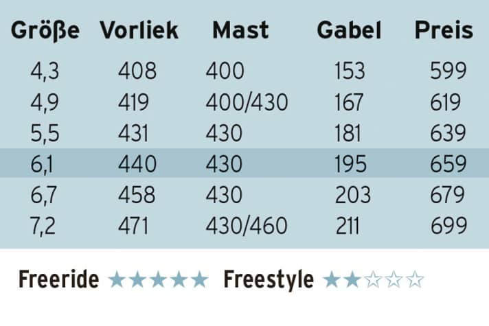 On the water:The NeilPryde sail is - in a positive sense - stupidly easy to surf. As stable as a sliding door, it stands in front of you, pull it tight, hook it in, and you're ready to go. The most stable sail in the group appears light and - on the standard mast - nice and tight. With a good twist, it absorbs gusts, looks quite racy and fast. However, if the wind is not sufficient for the good glider, it willingly accepts pumping help and can thus cover a large wind range in one trim, because it also remains stable and neutral in the hand at the top, without you having to pull it particularly flat beforehand. On the borderline between freemove and freeride, the Fusion offers good performance and a wide range of use, with good jibe handling - in the turn it shifts easily and with a smooth, imperceptible batten change. A real accelerator for power jibes or race jibes, as the sail accelerates you quickly out of the turn after a tight recovery. However, the long boom, ever-present residual profile and somewhat sluggish handling when ducking do not make it the favourite sail of the freestyle fraction. If you spend more time on the "wrong" side of the sail when manoeuvring, you should definitely choose a freestyle sail from NeilPryde.