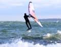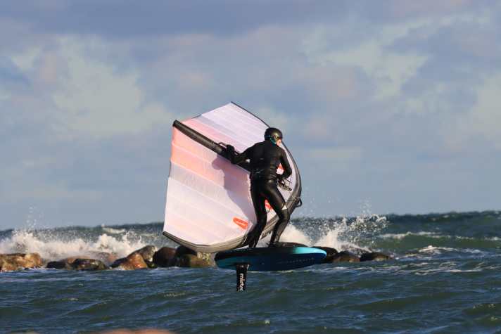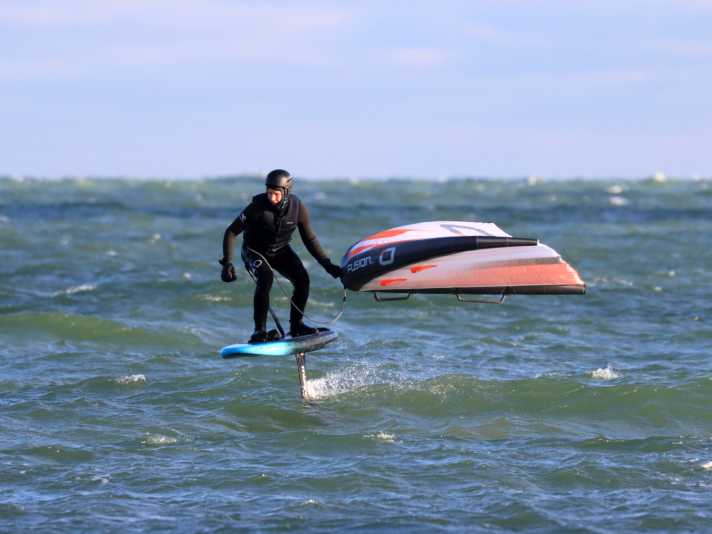 On the cross and in strong gusts, the pressure point remains as if nailed down, no fluttering or buckling disturbs the silent flight. The possible angles on upwind and downwind courses are also impressive, and the Fusion is very efficient in this respect. Because the handles protrude only slightly from the centre strut, the handling is very direct. However, this also means that you have to grip a little more precisely in manoeuvres in order to hit the handles cleanly. Keyword manoeuvres: The Ozone Fusion Wing also shines across the board here: The flat profile in combination with the slim wingtips results in very easy handling - the wing rotates quickly and can be guided with pleasingly low air resistance when manoeuvring upwind - so fast turns and jibes can be strung together in a matter of seconds. The Ozone Wing would also be predestined for jumps and freestyle rotations due to its high speed potential, but whether the chamber system can forgive heavy impacts in the long term should at least be left with a question mark. In any case, you should avoid longer swimming sessions and heavy washes in the surf - this is because the aforementioned air intakes allow noticeably more water to penetrate than in normal use on flat water, which is then noticeable when launching. However, the Wing is ideal for downwind sessions in the swell: it drifts neutrally and without any disturbing life of its own and its great performance ensures that you can quickly cross back to windward after the wave ride.