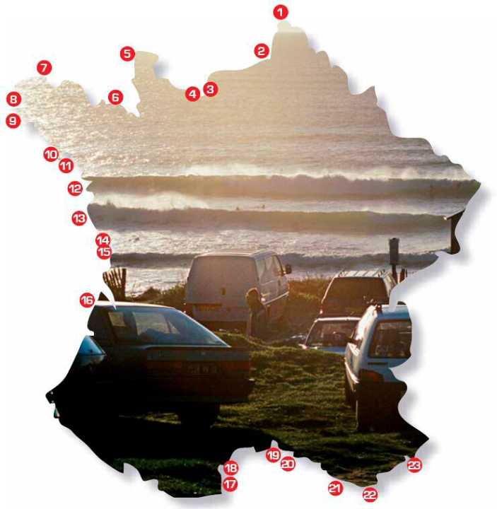 Errechnete Autostunden (Kilometer) von Frankfurt/a.M.: 1. Wissant: ca 5 h 43 (612 km) 2. Le Crotoy: ca 6 h 09 (663 km) 3. Le Havre: ca 7 h 02 (771 km) 4. Ouistreham: ca 7 h 30 (822 km) 5. Siouville: ca 8 h 57 (947 km) 6. St. Malo (Spot Le Sillon): ca 9 h 01 (982 km) 7. Le Dossen: ca 10 h 22 (1124 km) 8. Crozon (Spot Plage de l'Aber): ca 11 h 09 (1152 km) 9. Audierne (Spot Kersiny): ca 11 h 08 (1171 km) 10. Kerhilio: ca 9 h 49 (1059 km) 11. Penvins: ca 9 h 42 (1045 km) 12. La Baule (Spot Casino): ca 9 h 15 (1017 km) 13. St.Jean-de-Monts (Spot St.-Jean): ca. 9 h 30 (10118 km) 14. La Tranche (Spots Le Phare, l'Embarcadière): ca 9 h 36 (1041 km) 15. Ile de Ré (Spot Diamon Head): ca 9 h 43 (1058 km) 16. Hourtin (Spots Le Port, Piqueyrot, Hourtin Plage): ca 11 h 17 (1185 km) 17. St.Cyprien (Spot Cypriano): ca 10 h 19 (1168 km) 18. Leucate (Spot Le Coussoules): ca 9 h 50 (1119 km) $bildrechts_0 19. Fos-sur-Mer (Spot Le Cavaou): ca 9 h 05 (1016 km) 20. Le Prade (Épluchures Beach): ca 9 h (1010 km) 21. Brutal Beach: ca 9 h 25 (1064 km) 22. L‘Almanarre (Halbinsel Giens): ca 9 h 50 (1095 km) 23. Cannes (Spot Palm Beach): ca 10 h (1039 km) 24. Calvi (Spot Club Olympique): ca 15 h (1300 km) 25. Bonifacio (Spots Santa-Manza, Piantarella): ca 17 h (1400 km)