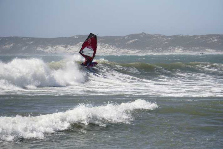 Langebaan ist seit über 20 Jahren einer der Spots für die surf-Tests – aus gutem Grund. Der Ort, etwa 1:30 Autostunden nördlich von Kapstadt gelegen, bietet ein derart gutes Gesamtpaket, dass man auch hier dauerhaft seine Zelte aufschlagen kann. Supermärkte, Surfschule, Restaurants und Shoppingmöglichkeiten sind direkt vor Ort verfügbar, außerdem geht es hier deutlich entspannter zu als in der Millionenmetropole Kapstadt. Langebaan punktet auch mit sehr großem Windfenster und abwechslungsreichen Bedingungen: Normaler Wind aus Süd bis Südost ist ähnlich stark wie in Kapstadt und kommt sideshore von links. Der Einstieg vor dem Cape Sports Center ist flach und sandig, bei Ebbe gibt es sogar einen kleinen Stehbereich. Eine Landzunge blockt die Windwellen, sodass man auf den ersten 200 Metern im spiegelglatten Wasser seine Manöver und Freestyletricks zelebrieren kann. Weiter draußen wird es dann, je nach Tide, etwas kabbeliger; wer möchte, kann aber lange Runs in Richtung des gegenüberliegenden Ufers machen. Swell kommt in Langebaan kleiner an als an den exponierten Spots. Wenn West oder sehr großer Südwestswell im Anmarsch sind, drehen aber immer wieder saubere Lines in die Bucht. Direkt in Lee der beiden Landzungen kann man dann Turns oder Aerials auf saubere Wellenfaces zirkeln. Einen richtigen Wavespot mit Sideshorewind findet man im Umkreis dann in Swartriet oder am Club Mykonos. Dieser bietet bei Südostwind, Swell und Niedrigwasser nette Sprungbedingungen in Luv einer Ferienanlage. Auch Südwest-, West- und Nordwestwind werden in Langebaan aufgrund der umgebenden Hügel noch lokal verstärkt, sodass man hier auch dann noch eine gute Session bekommt, wenn die Spots rund um Kapstadt keinen Wind abbekommen. Meistens bietet die Bucht an solchen Tagen dann Bump-&-Jump-Bedingungen, ein Blick in die nahe Shark Bay ist dann auch eine Empfehlung!