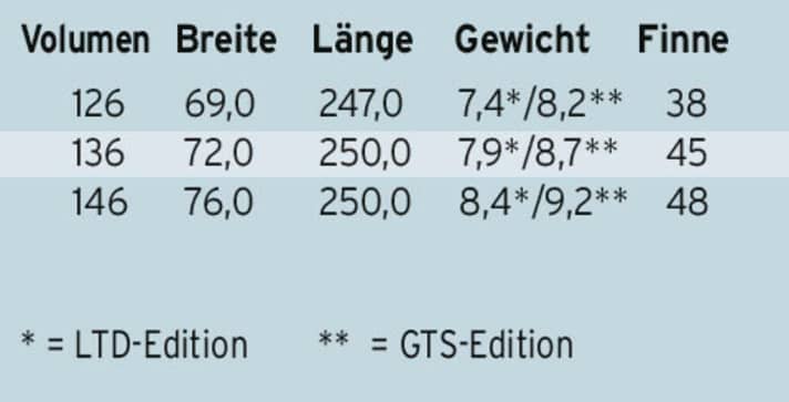 surf-Messung: Volumen: 138 L Gewicht: 7,80 kg Länge: 249,5 cm Breite: 72,0 cm