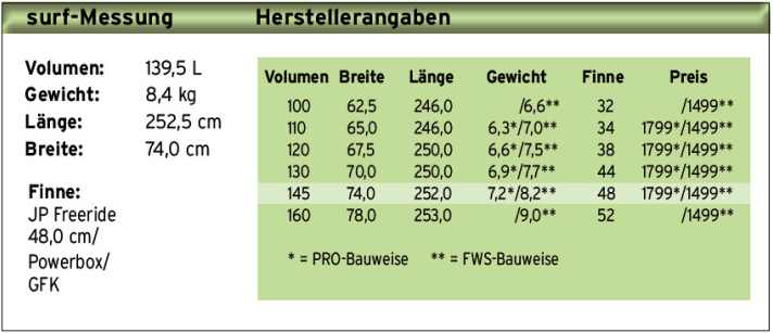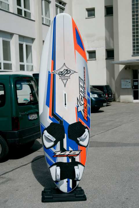 Bei unseren Vergleichsfahrten war der JP im Topspeed nur minimal langsamer als der große Lorch. Das Board wirkt aber spritziger, macht mehr Spaß und wäre daher für bessere Surfer, die so viel Volumen möchten, unsere erste Empfehlung. Die Gleitreserven sind riesig und klassische weite Powerhalsen gelingen auf dem 145er wunderbar – so gut wie man es maximal in dieser Boardgröße erwarten kann.