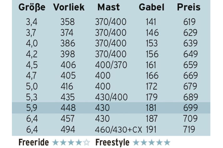 An Land: Die bewährten Trimmmarkierungen leiten dich schnell zum richtigen Setup, dann liegt ein vergleichsweise etwas flacheres Segel vor dir. Mit sehr kurzer Gabel, Top-Ausstattung, guten Verstärkungen, viel X-Ply oben und relativ dickem Monofilm im Fensterbereich.