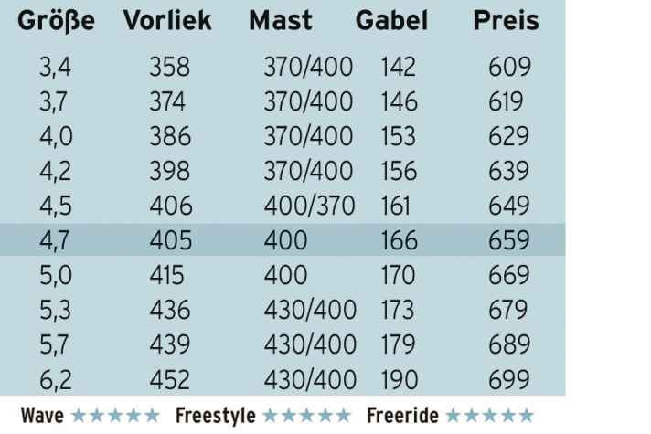 An Land: Das North-Segel wirkt besonders solide, mit dickem Film und vielen Verstärkungen. Der neue Protektor ist richtig fett und stabil geworden. Das Loose Leech konzentriert sich stärker auf den Toppbereich, daher sind die Markierungen für den Trimm zusammengerückt. Mit einer Vorliekseinstellung knapp unter “max” deckt man aber bereits einen sehr breiten Bereich ab, ohne umzutrimmen. Sinnvolle Drucke – wie die unterschiedichen Gabeleinstellungen bei unterschiedlicher Montagehöhe – beweisen Liebe fürs Detail.