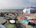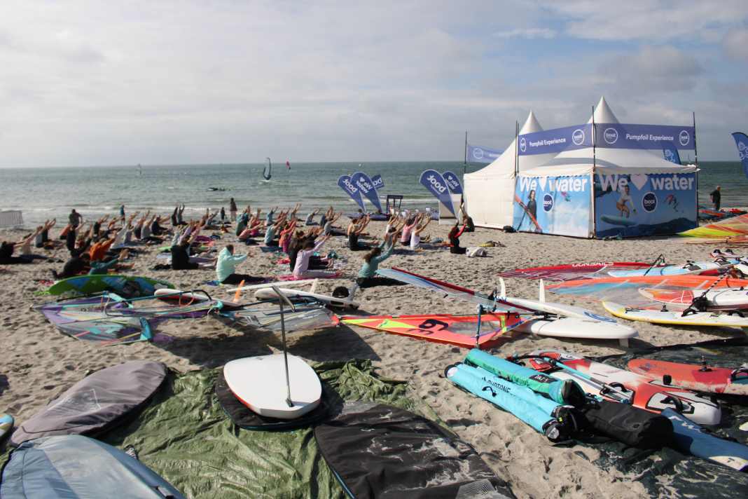 Als der Wind am späten Nachmittag nochmals zulegte, wurden die Schlangen an den Ausleih-Stationen der Austeller länger, am Strand lagen nur noch die ganz großen Segel. Ansonsten war alles auf dem Wasser, was einigermaßen Auftrieb hatte. Schon am Morgen waren mit der ersten Brise jede Menge Tester aufs Wasser gegangen, da allerdings noch mit etwas Bewölkung. Als Nachmittags dann die Sonne rauskam, wurde ein echter Bilderbuch-Tag daraus, wie er besser nicht zum Surf-Festival passen könnte.